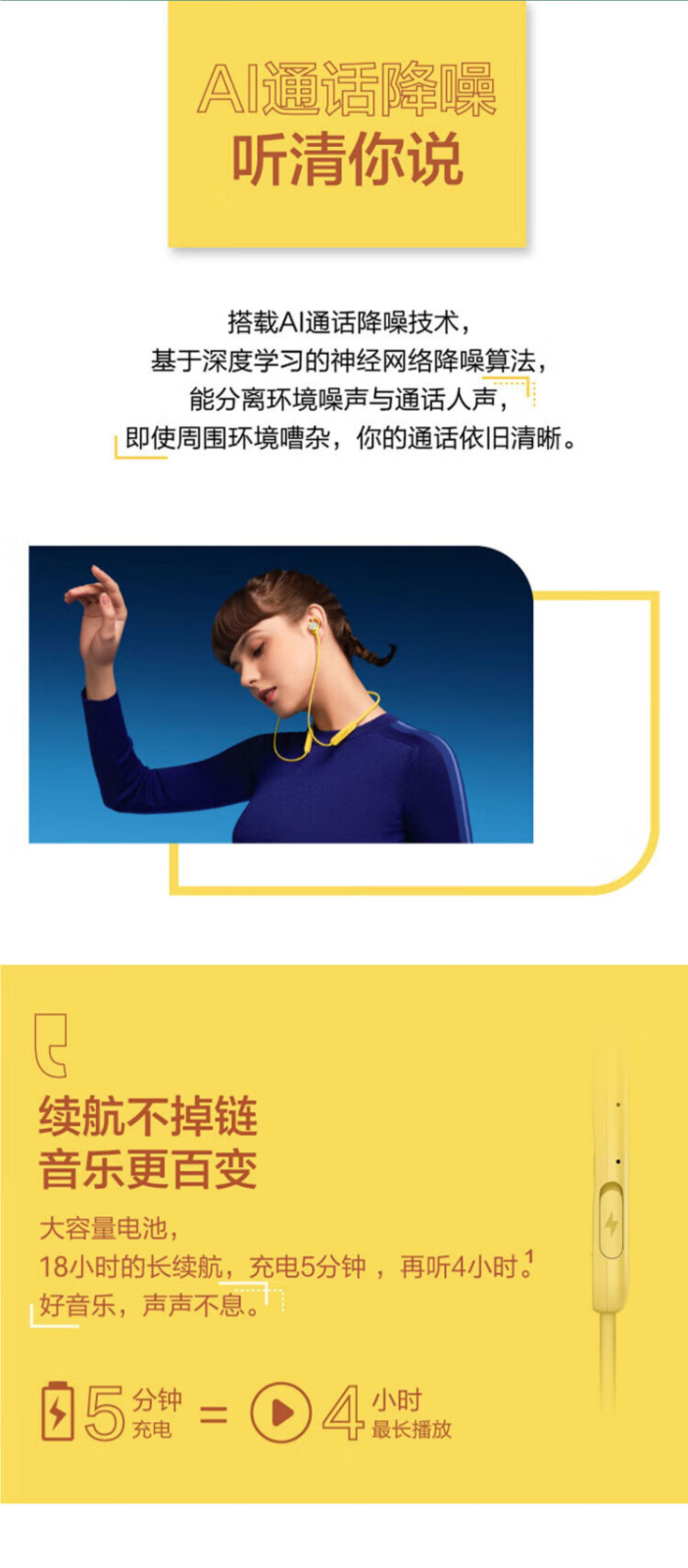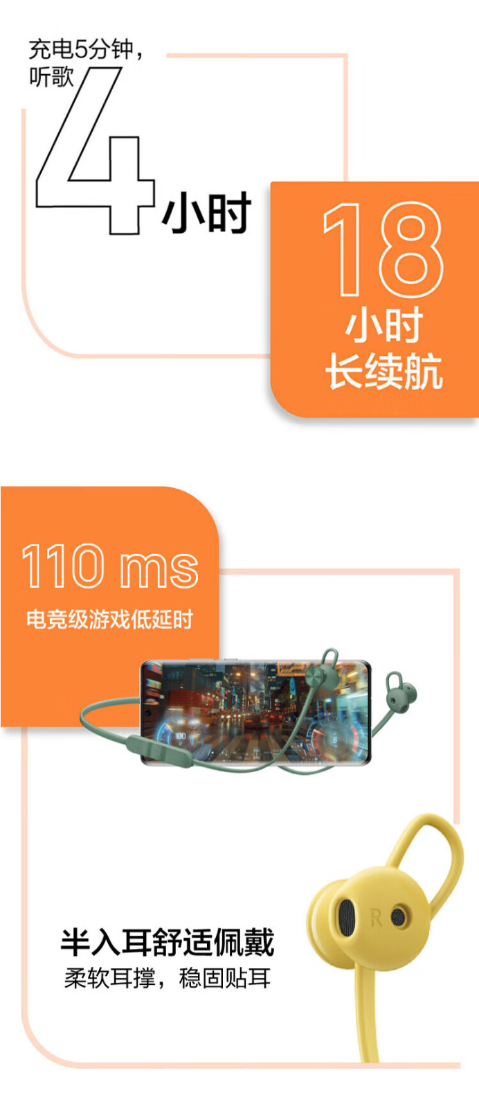 13mm大动圈,充电五分钟听歌四小时,18小时长续航 半入耳式运动耳机