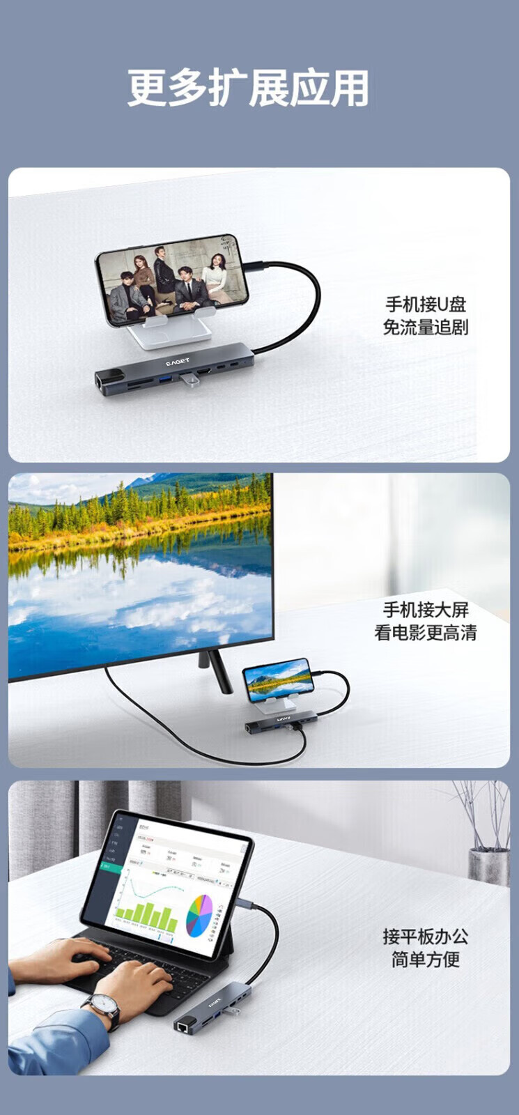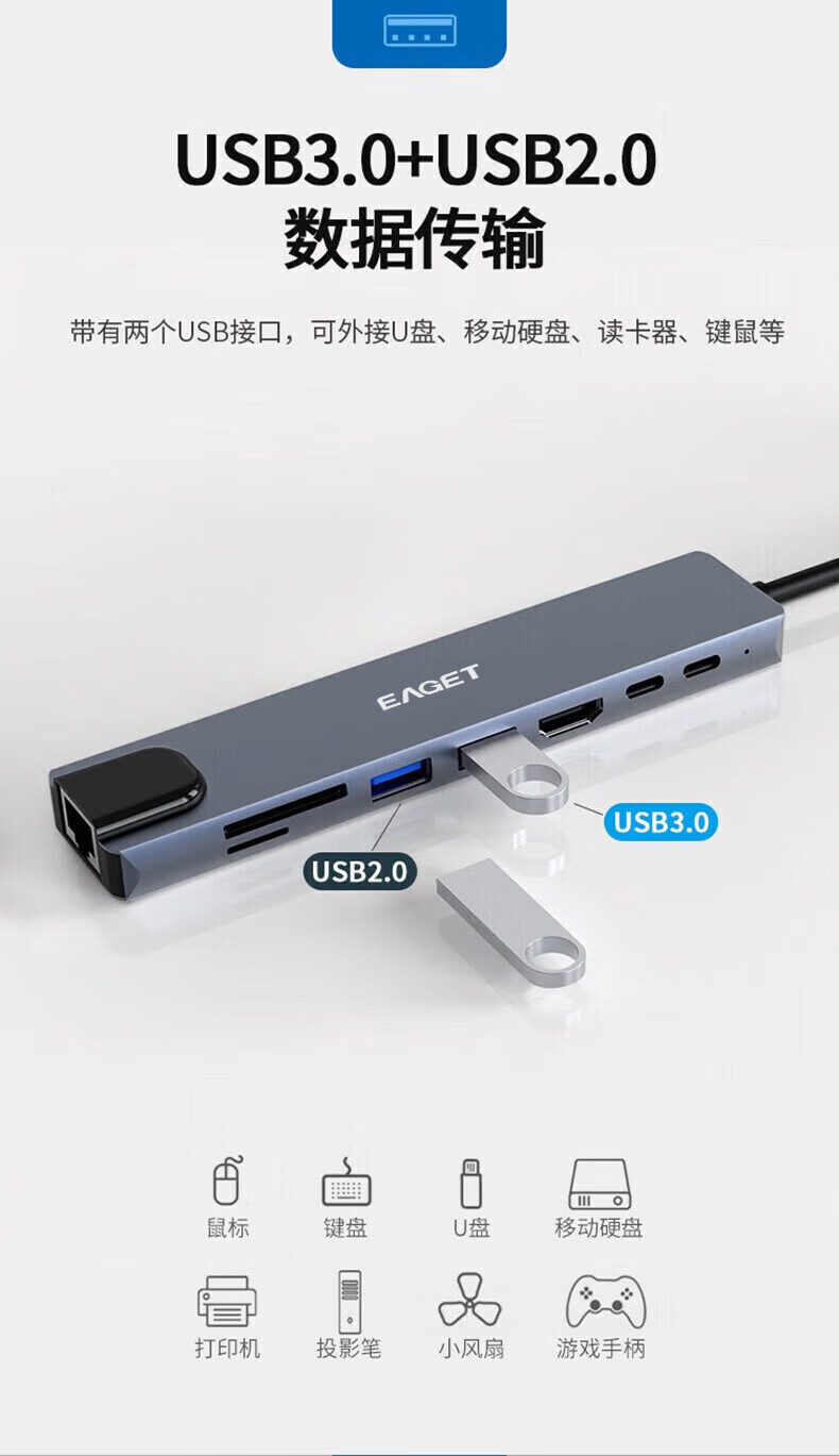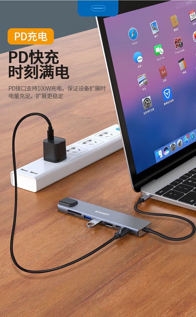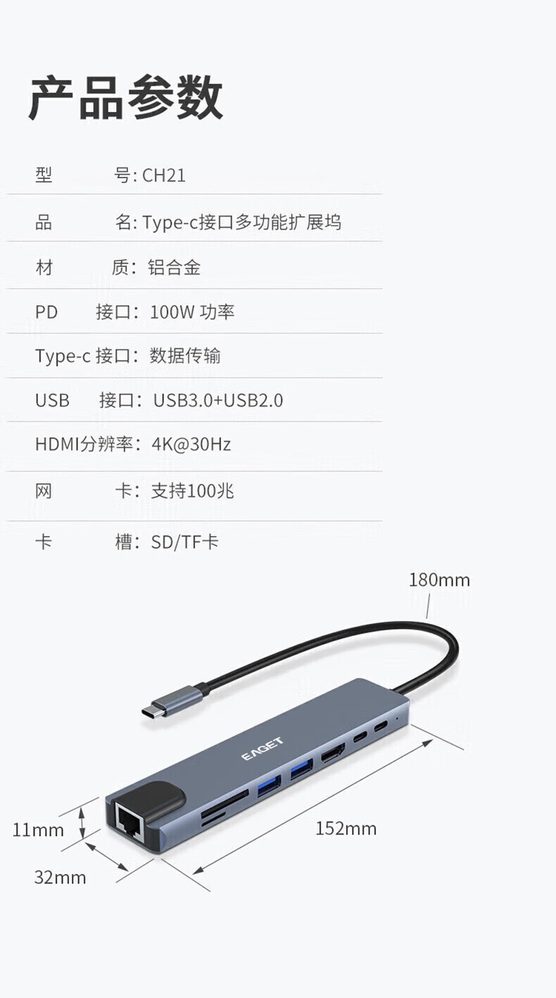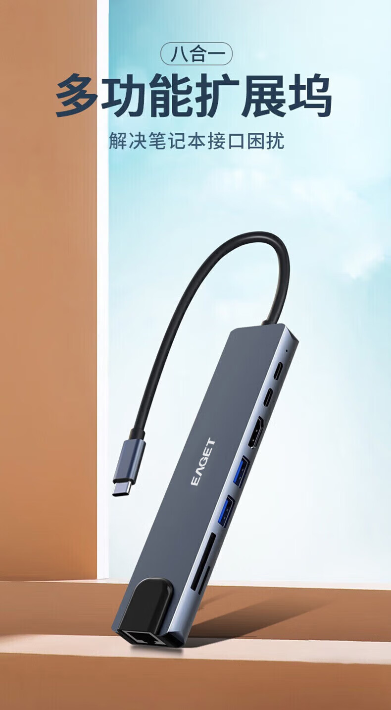 忆捷 CH21 Type-c接口八合一多功能拓展坞 USB3.0+USB2.0接口
