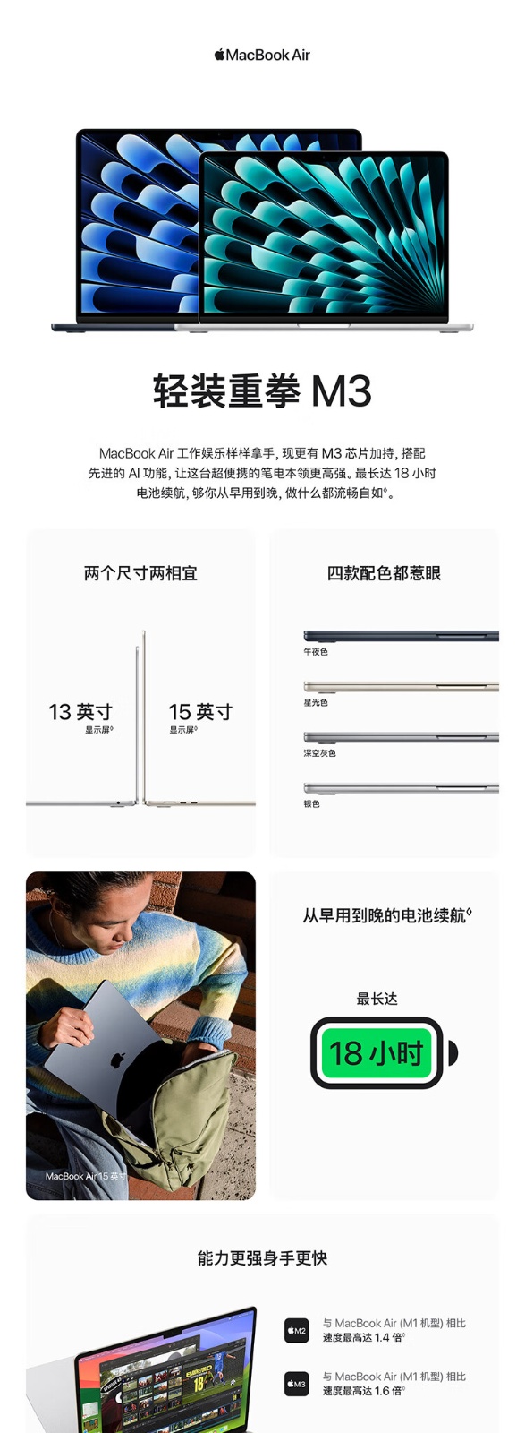 MacBook Air 2024款(M3芯片/16G/256G/星光/15英寸/9F4)