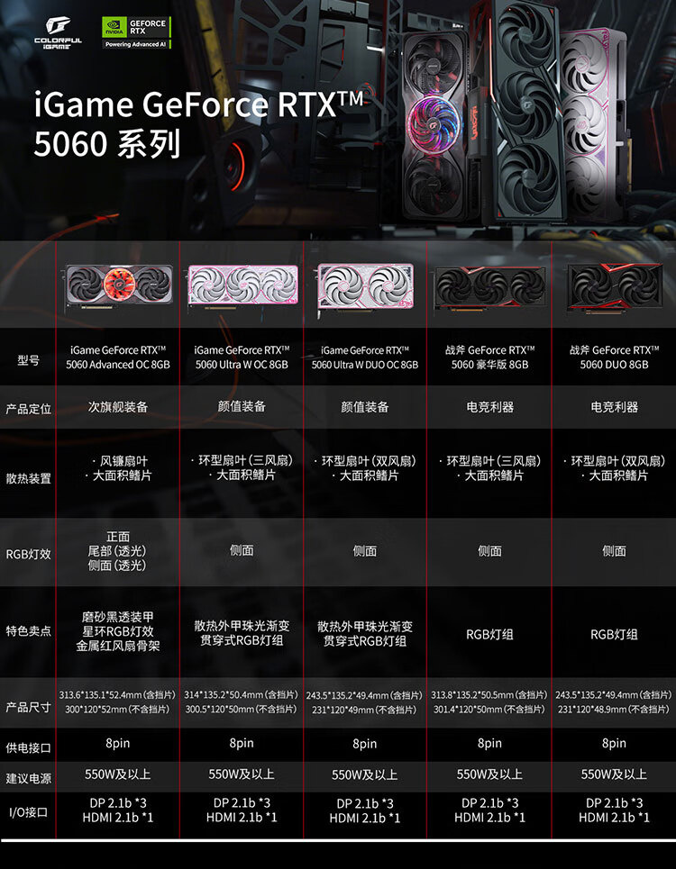 七彩虹 iGame GeForce RTX 5060 Advanced OC 8GB(大红圈3风扇,黑红)