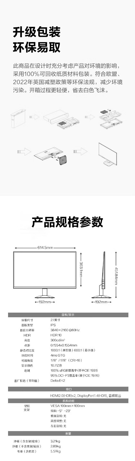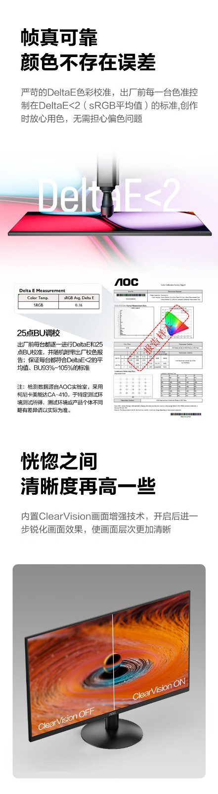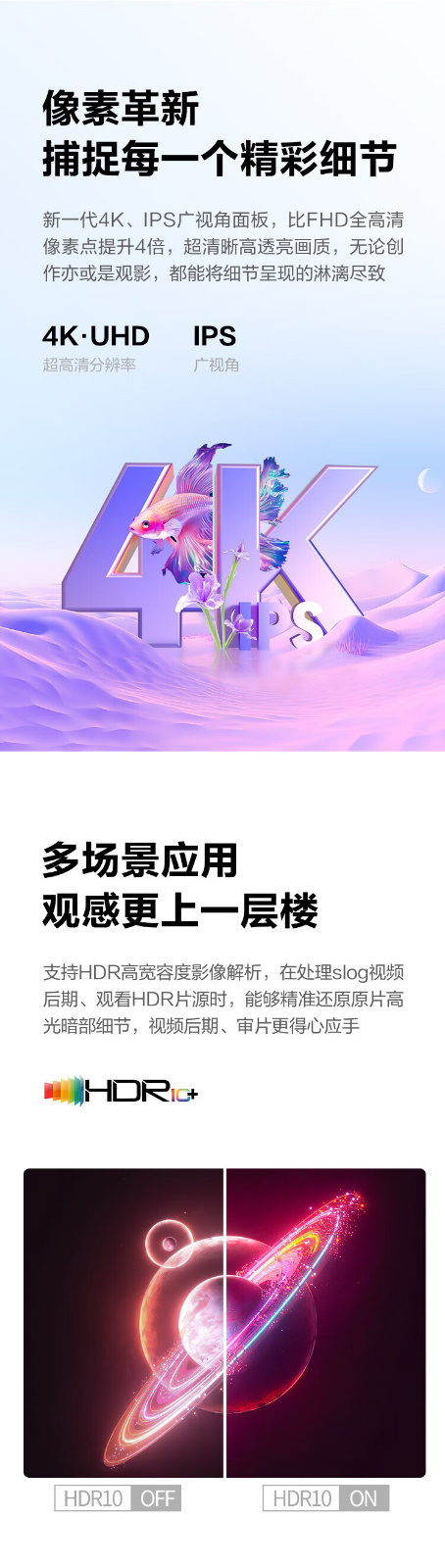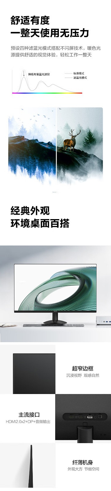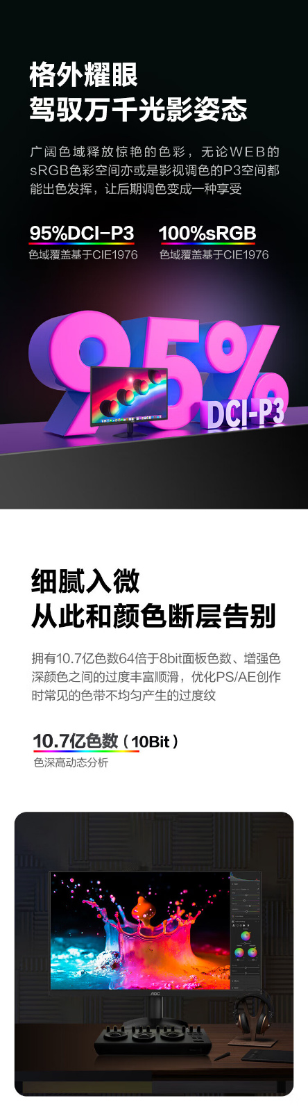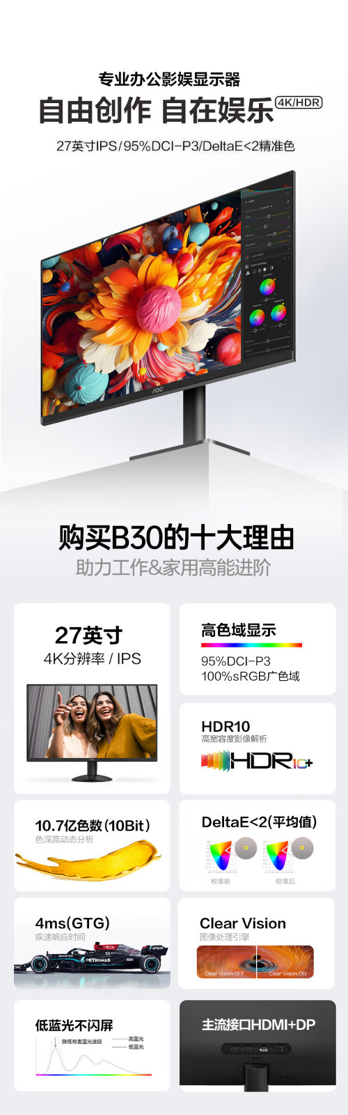 广色域10.7亿色数低蓝光不闪HDR10台式电脑Clear Vision功能办公显示屏