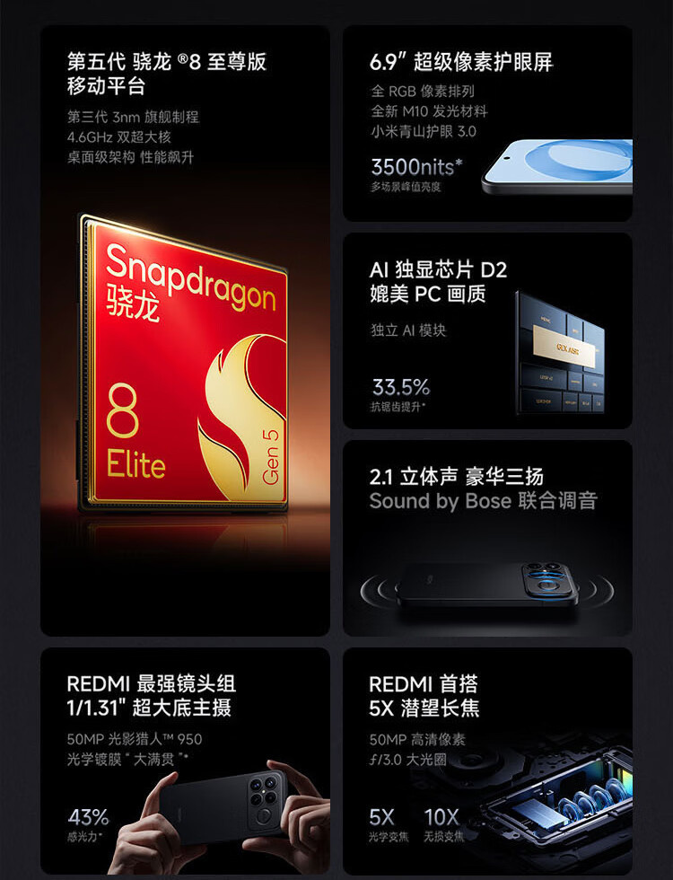 第五代骁龙8至尊版 7560mAh大电池 BOSE联合调音 红米5G手机