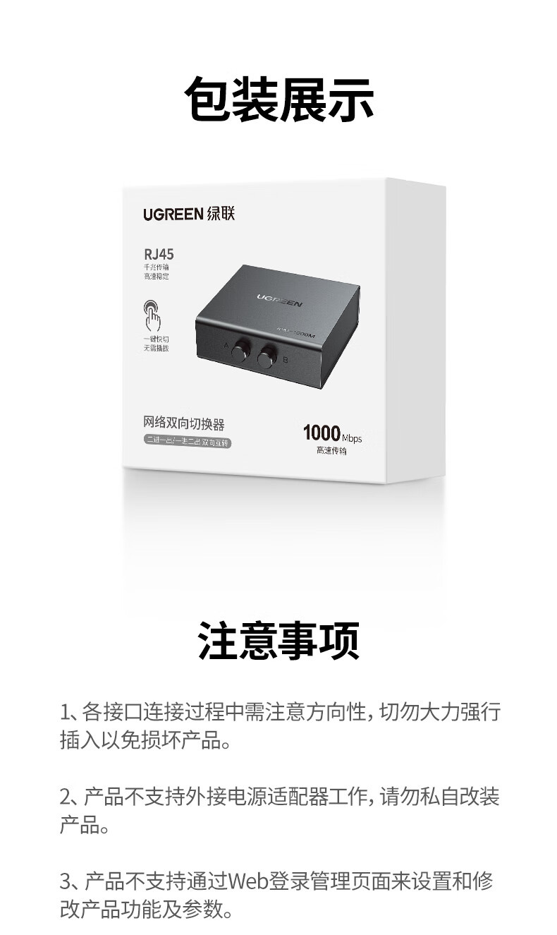 绿联 RJ45 55472 二进一出/一进二出 网络切换器