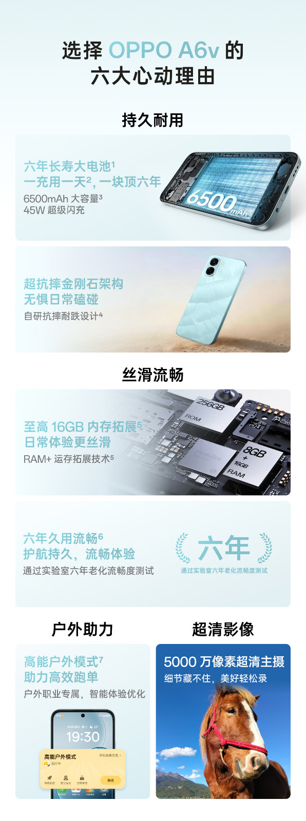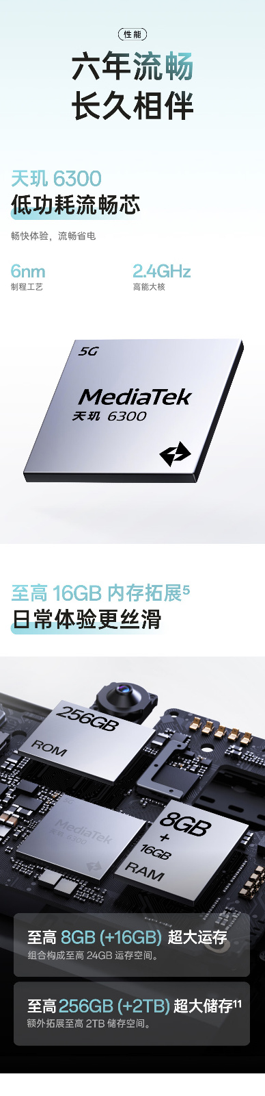 6500mAh 六年长寿大电池 | 至高 16GB 内存拓展 | 六年久用流畅