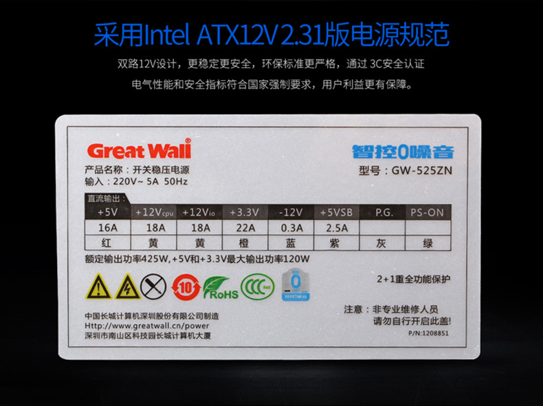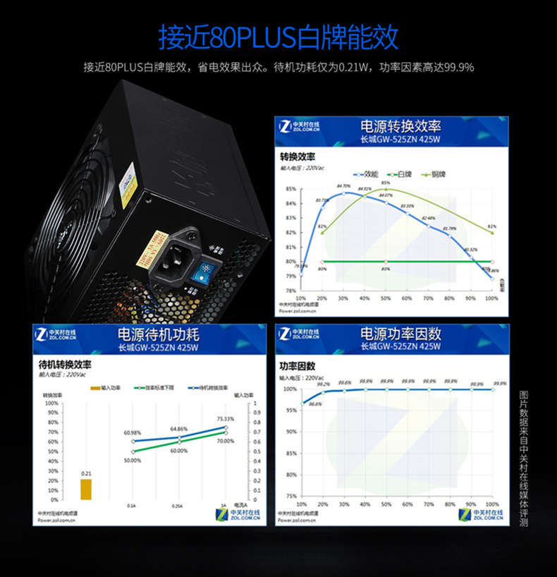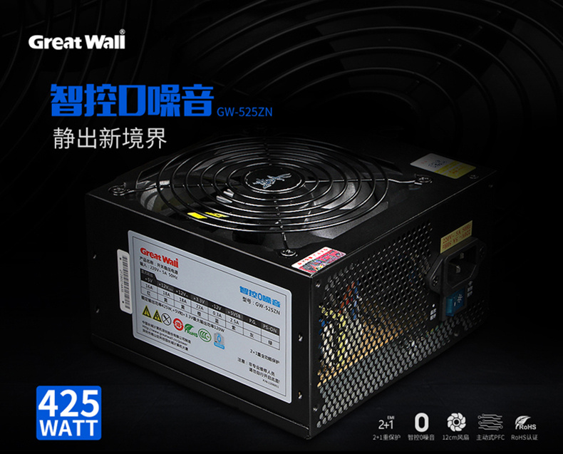 盒包,额定425W,最大525W,12CM智控风扇,静音长寿。