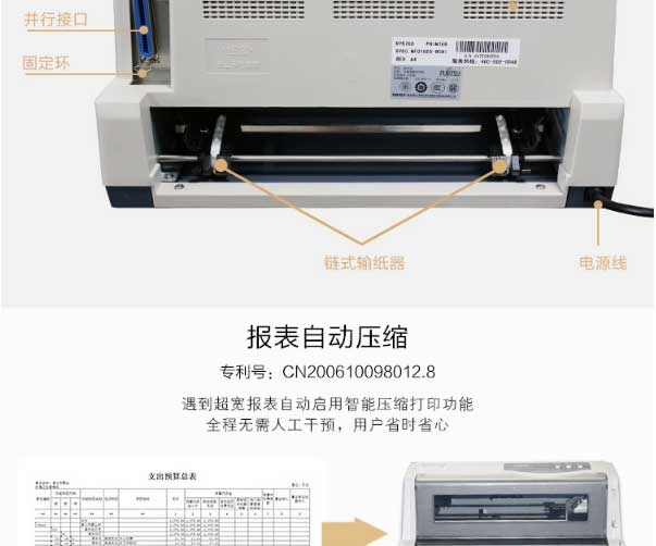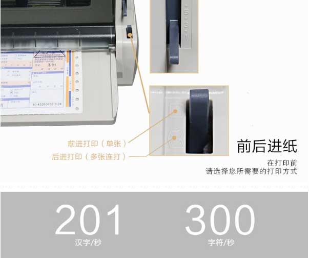 | 出纸方式 | 单页纸:摩擦走纸,连续纸:推进式链式走纸 |