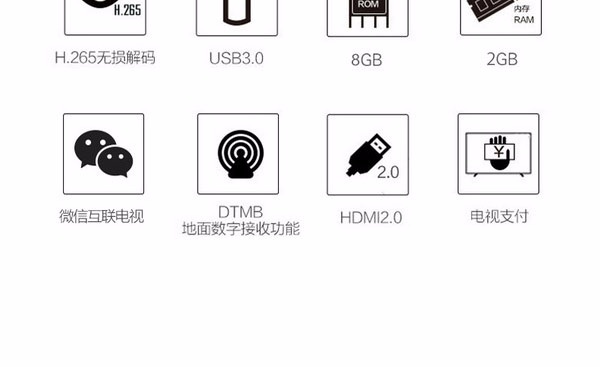 | 接口类型 | 同轴x1,有线电视x1,AV输入x1,HDMI2.0x2,USB3.0x1,USB2.0x1,网络接口x1 |
