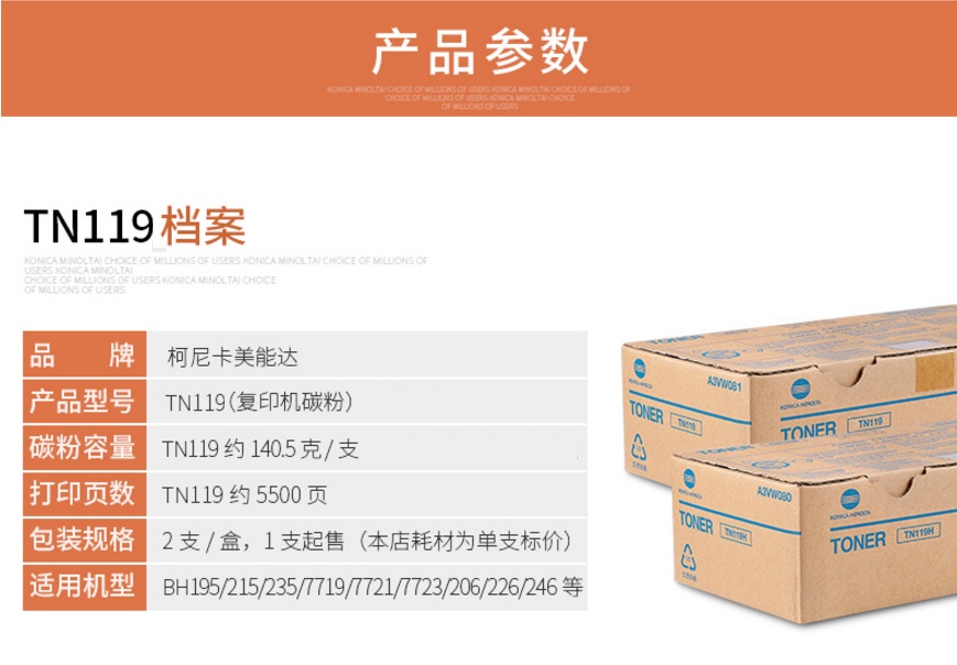 柯尼卡美能达 TN119 低容 墨粉 BH 206 226 246 碳粉 粉盒 黑色(标准容量140克 5500张)