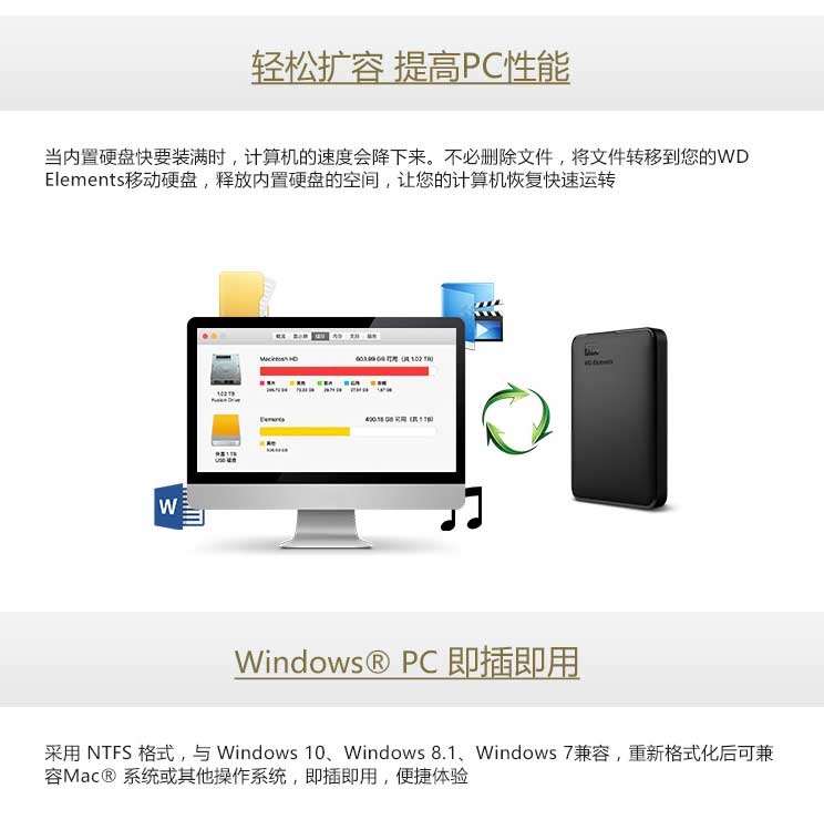 | 特性 | 在 Mac OS X 10.6.5+ 使用需要重新格式化;适合 Windows XP、Windows Vista、Windows 7、Windows 8 的 NTFS 格式;内置WD SmartWar |