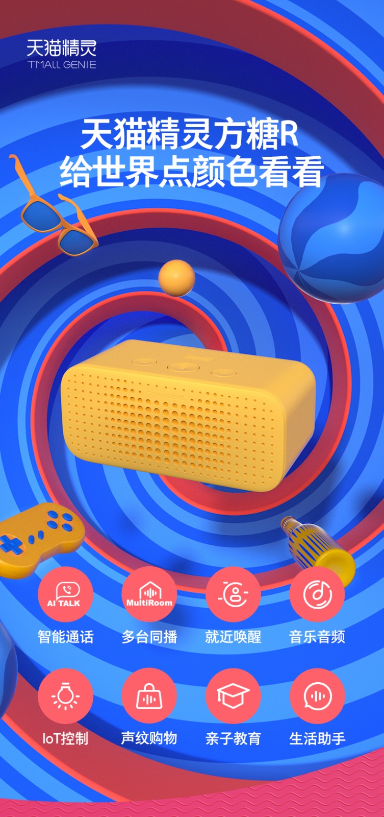 新品升级,智能通话,多台同播,就近唤醒,音乐音频,loT控制,声纹购物,亲子教育,生活助手