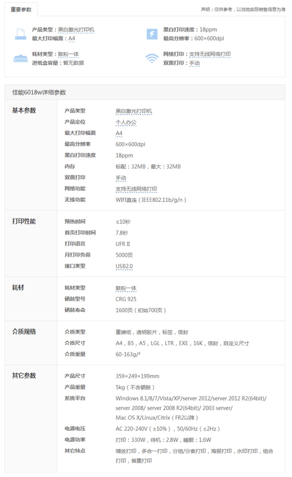 佳能 LBP6018W 黑白激光打印机