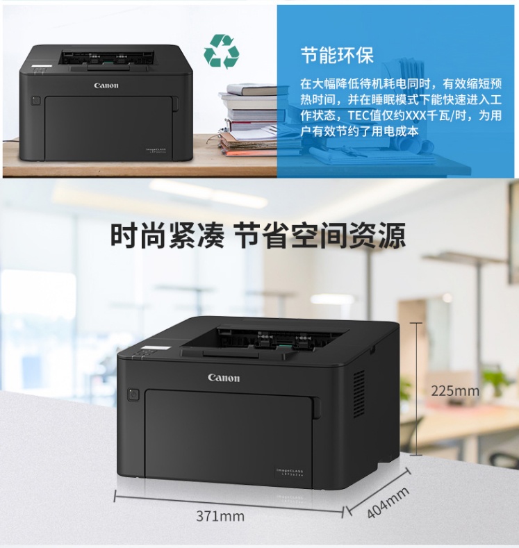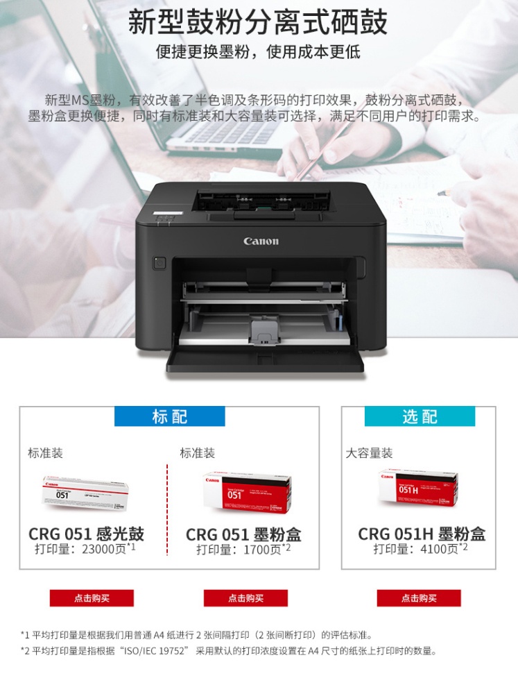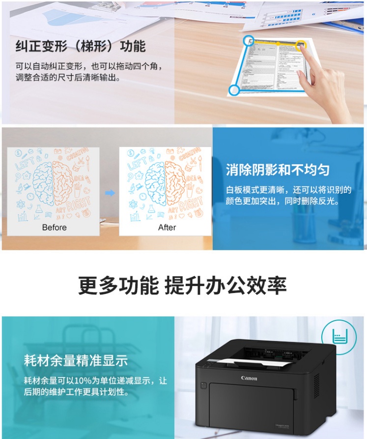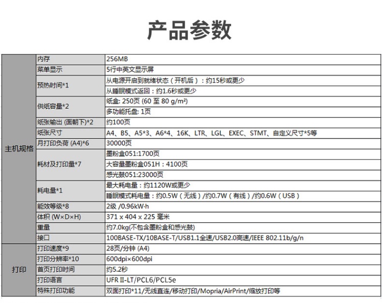 | 包装清单 | 主机*1,随机佳能黑色墨粉*1,佳能黑色感光鼓*1,电源线*1,入门指南*1,软件光盘(CD/DVD-ROM),USB2.0线,保修卡*1 |