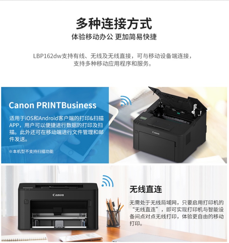 | 特征 | 支持双面打印,鼓粉分离式耗材,耗材更换便捷,使用成本更低。体积小巧 无线打印 双面打印 |