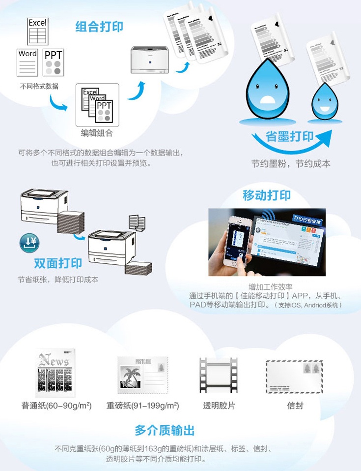 | 接口 | USB 2.0高速,10BASE-T/100BASE-TX (RJ-45) ,IEEE 802.11b/g/n(仅限LBP6230dw) |