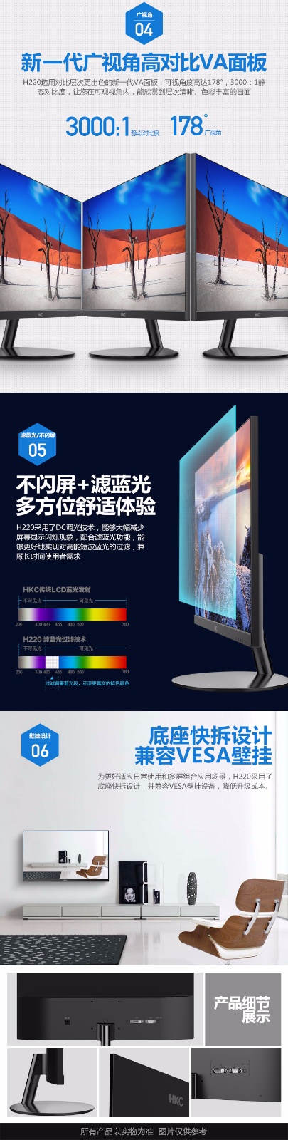 无边框,5mm黑边,10mm纤薄机身,176度广视角,3000:1高静态对比,不闪屏+滤蓝光,国家节能认证