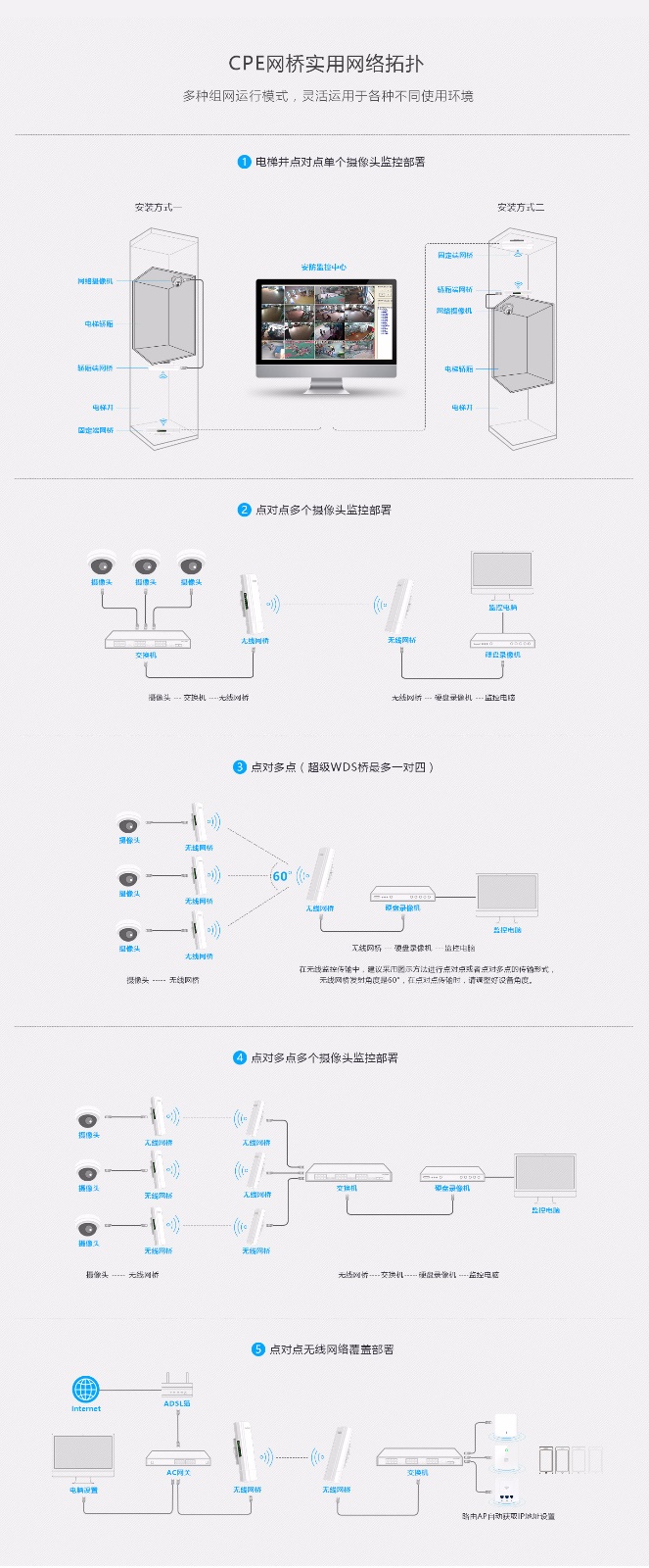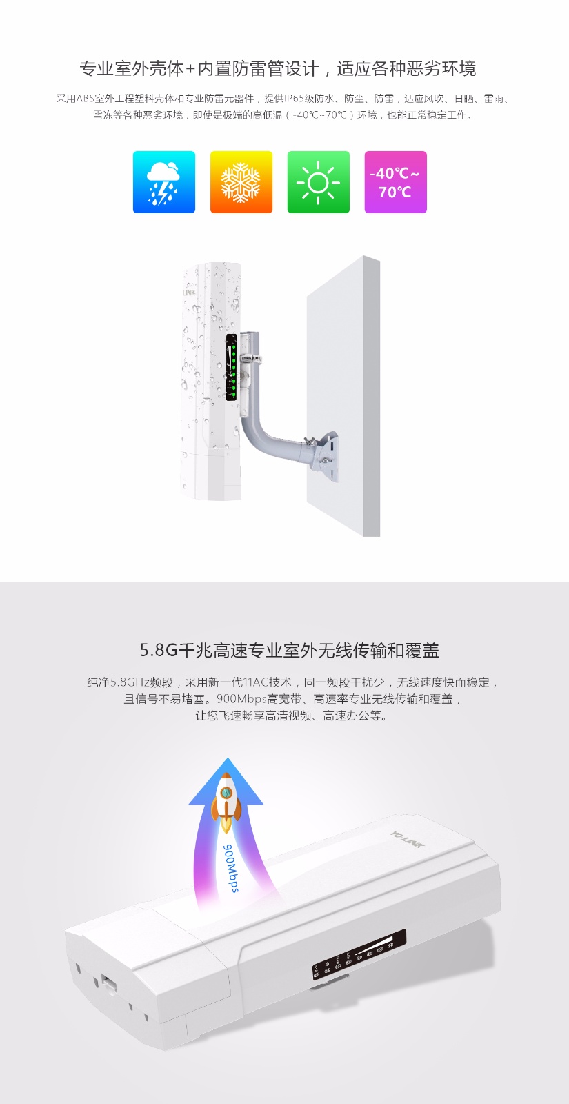900Mbps 5G无线网桥,传输距离10公里,接入网口千兆,24V POE供电或DC供电,数显IP、信道、信号强弱,按键桥接,IP65防护等级,吞吐量350兆,用于主干数据传输。