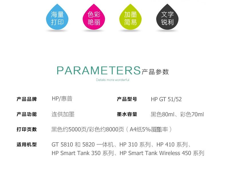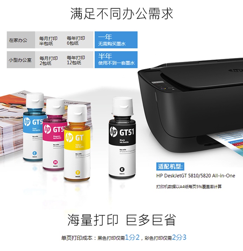 惠普原装墨水GT53XL/5810 135ML 黑 适应于GT5810 5820 Tank118 310 318 319 410 411 419