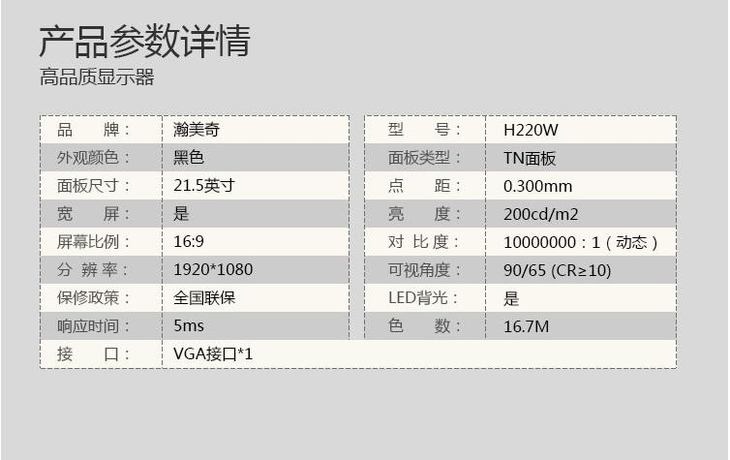 瀚美奇 21.5英寸 H220W 黑色 VGA 液晶显示器