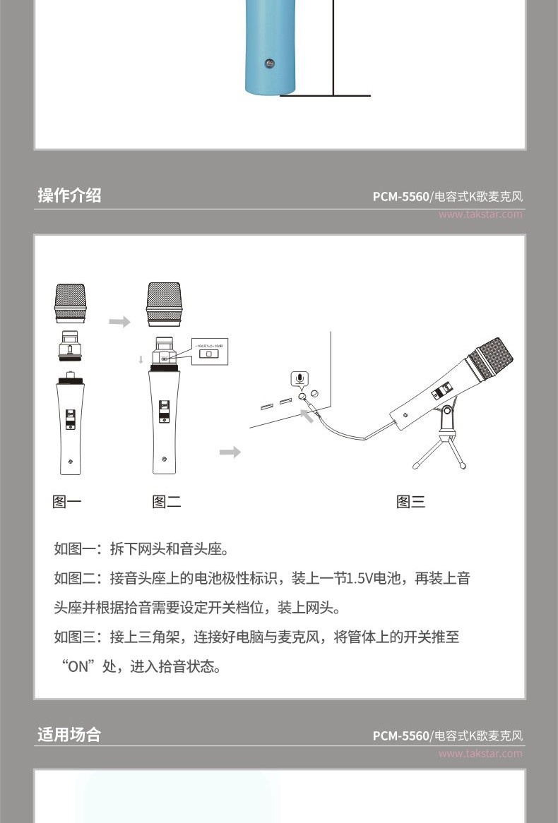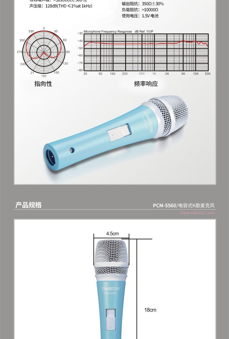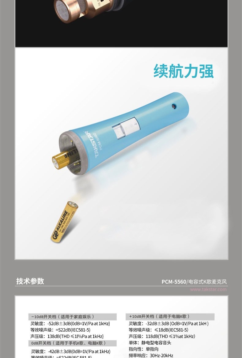 • 个性的外观造型,多种颜色可选,将专业与时尚亲密结合• 采用高效电声转换技术,将声音自然、清晰的重现• 三档拾音灵敏度调节,适用于多种场合拾音• 高灵敏度和低阻抗设计,兼容电脑集成声卡或外置声卡连接• 内置高效过滤海棉,有效滤除呼吸声及风噪• 配置C2-1手机K歌专用转换线,手机K歌更加方便、音质更佳• 采用一节1.5V AAA电池供电,连续使用时间长达360小时
