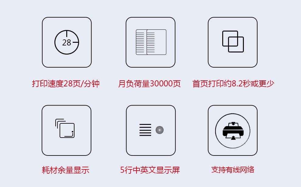 | 包装清单 | 主机*1,随机硒鼓*1,驱动光盘*1,电源线*1,保修卡*1,使用说明书*1 |