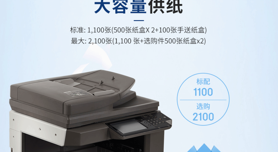 | 纸张容量 | 标准:1,100张(500张纸盒x2+100张手送纸盒) 最大:2,100张(1,100张+选购件500张纸盒x2) |
