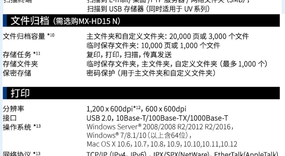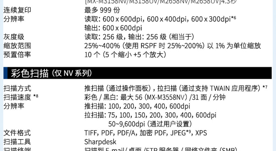 | 扫描文件格式 | TIFF,PDF,PDF/A,加密PDF,JPEG,XPS |