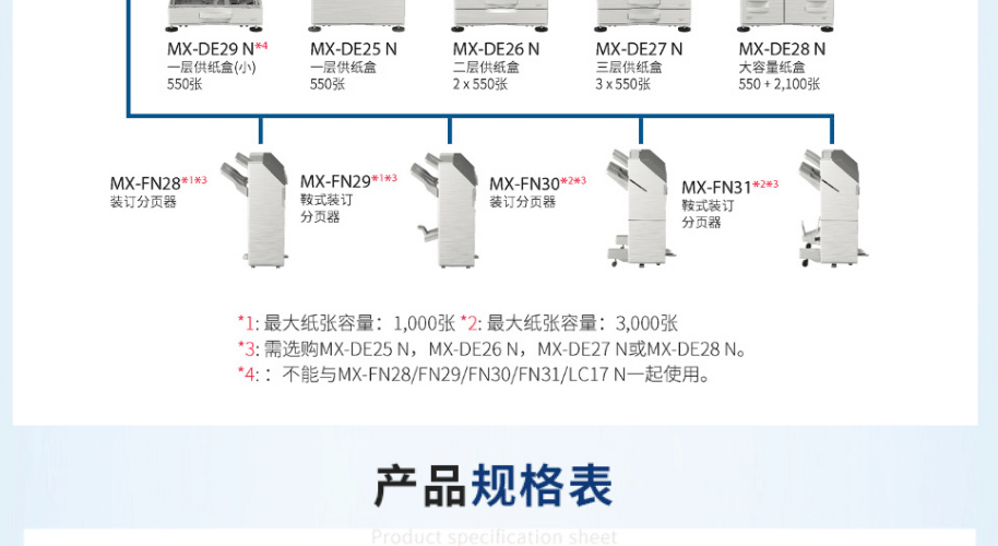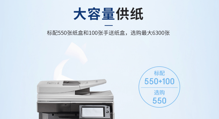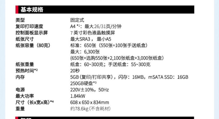 | 纸张容量 | 标准:650 张(550 张纸盒+100 张手送纸盒) 最大:3,100 张(标配600 张,选购件500 张+2,000 张) |