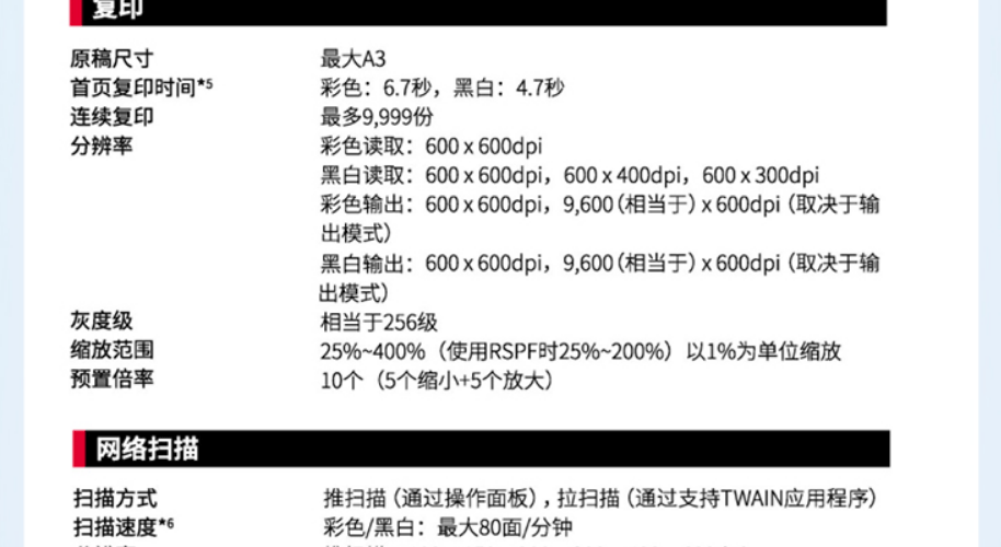 | 首页复印时间 | 彩色:6.7秒,黑白:4.7秒 |