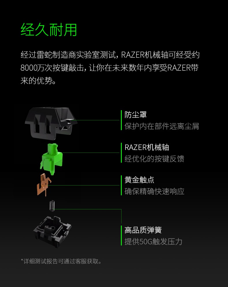 | 技术规格 | 50克触发力,Razer 机械式按键开关 8,000万次按键寿命 Chroma幻彩个性化背光系统有1,680万个色彩选项 |
