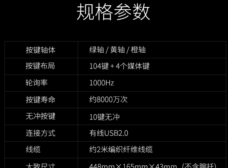 | 包装清单 | 键盘x1,腕托x1,重要产品信息指南x1 |