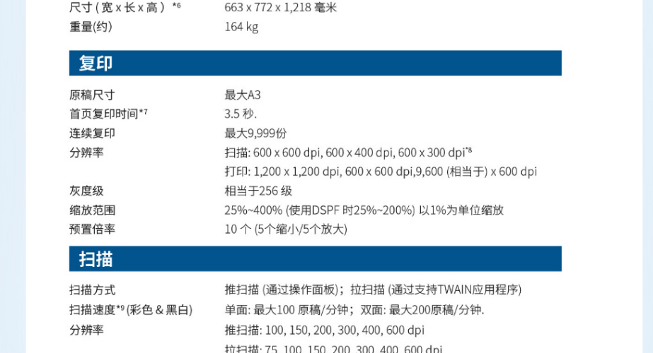 | 扫描速度 | 单面:最大100页/分钟 双面:最大200页/分钟 |