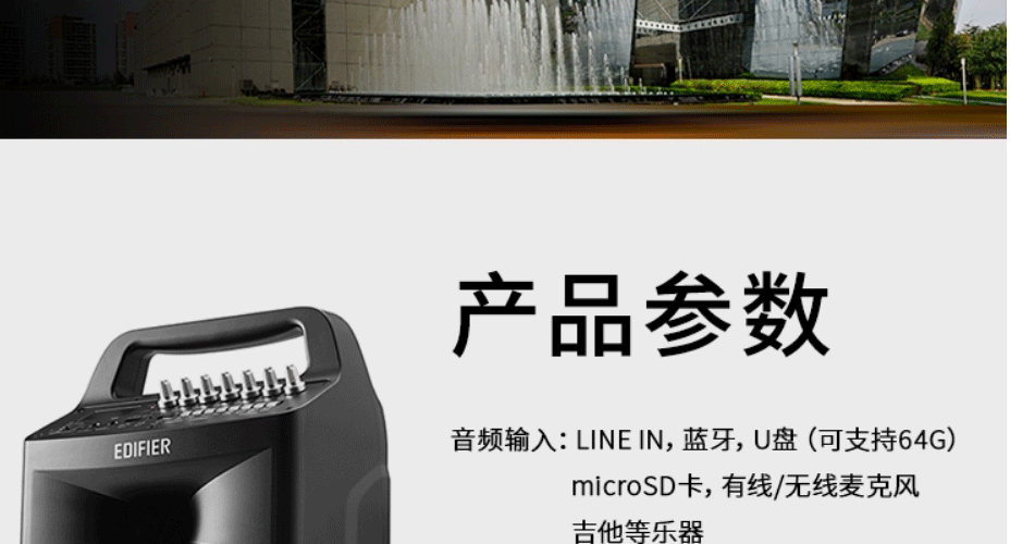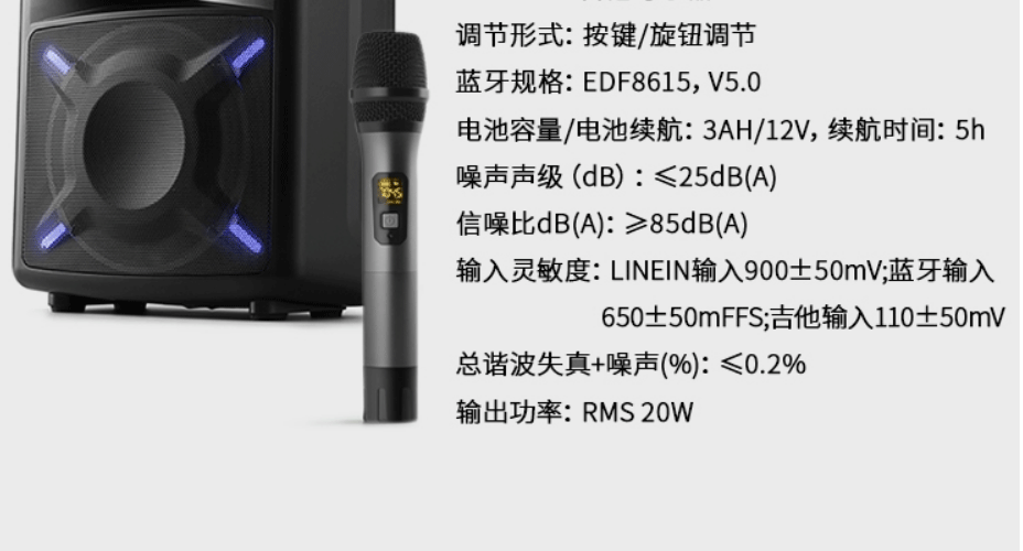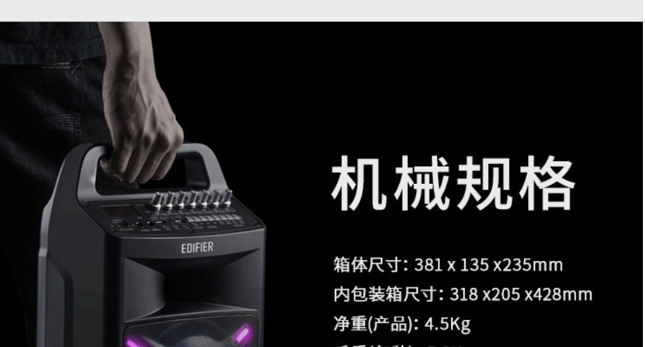 | 包装清单 | 音箱× 1、无线麦克风× 1、电源线× 1、USB-DC线× 1、音频线× 1、说明书× 1、保修卡× 1 |