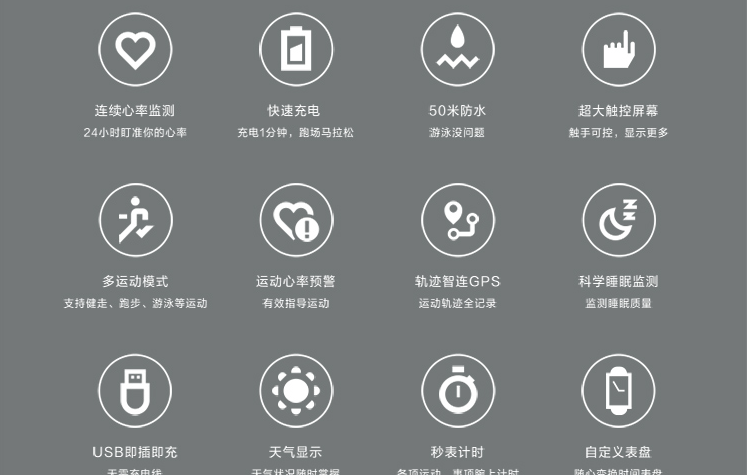 24小时心率监测,自动感应进入跑步模式,好友PK,拒接来电,睡眠检测,防水续航棒