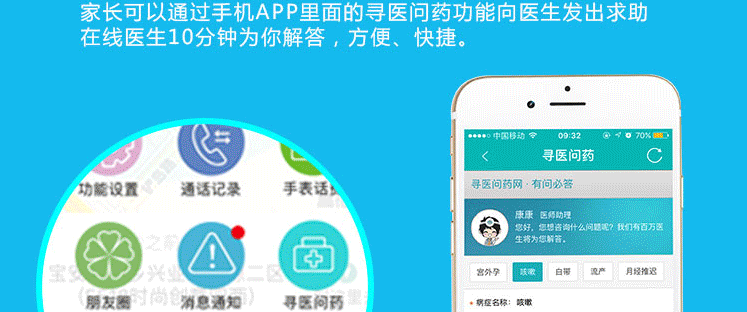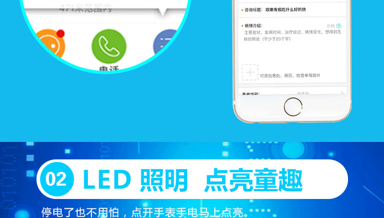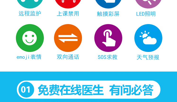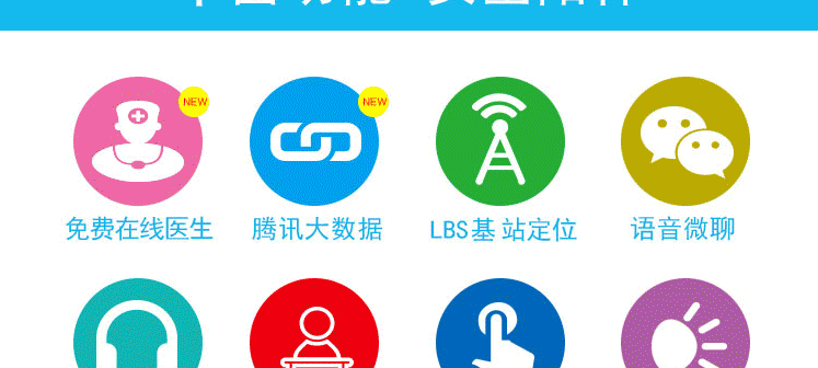 SOS求救、免费在线医生、远程监护、语音微聊、LED照明、彩色触屏版