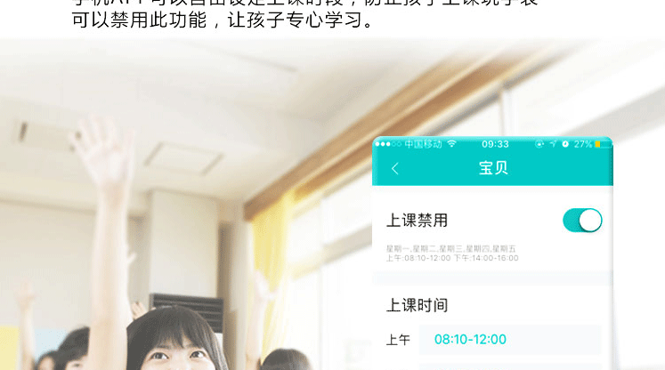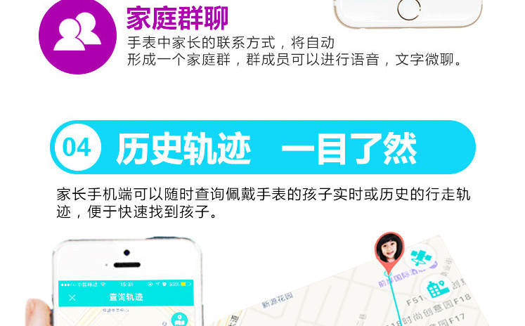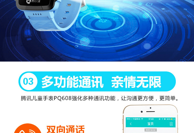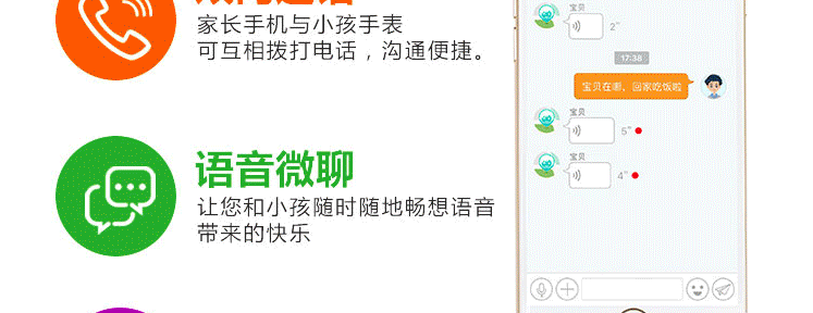 | 其它功能 | 语音微聊,家庭群聊,上课禁用,SOS求救,远程监护 |
