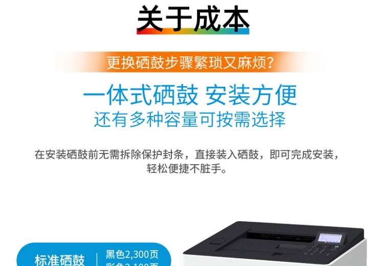 | 包装清单 | "主机x1,一体式鼓粉盒x4,电源线x1,入门指南x1, 基础操作指南/软件指南(DVD-ROM)x1,USB2.0 x1,保修卡x1" |