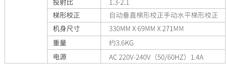 | 包装清单 | 电源线 ×1 VGA线 ×1 遥控器 ×1 两节AA型号电池 ×1 简易说明书 ×1 |