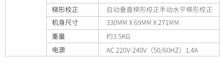 | 包装清单 | 电源线/VGA线/遥控器/两节AA型号电池/简易说明书 |