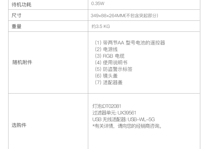 | 包装清单 | 带两节AA型号电池的遥控器 / 电源线 / RGB电缆线 / 镜头盖 / 使用说明书 / 安全标签 / 适配器盖 / |
