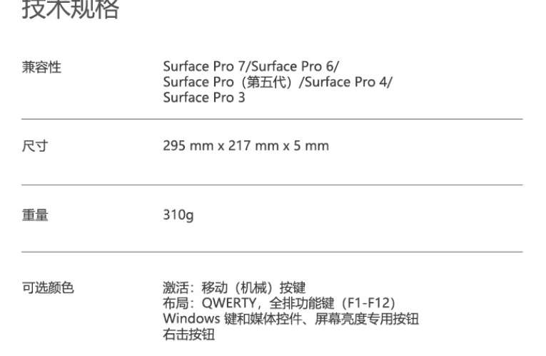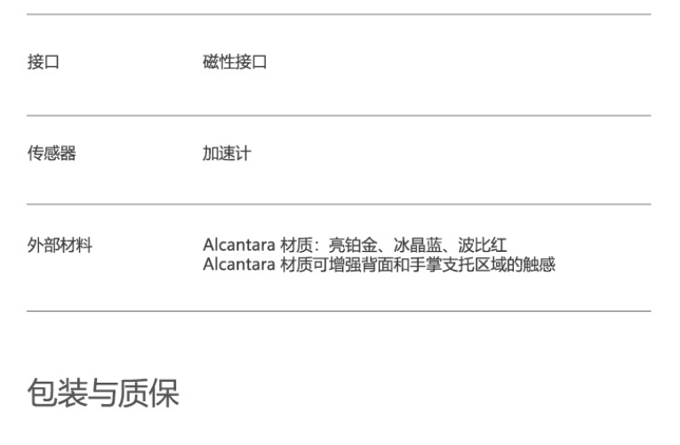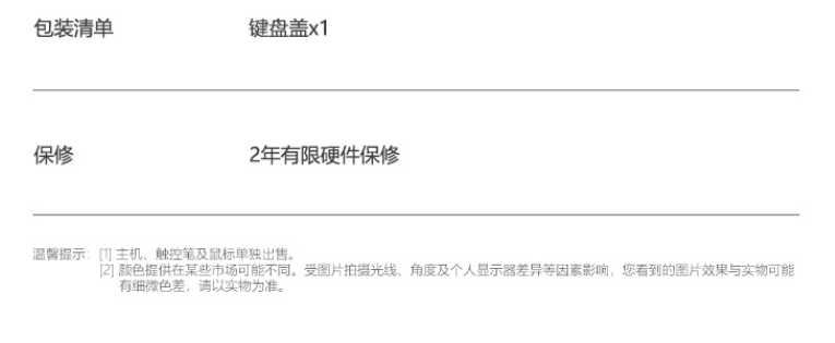 | 包装清单 | Surface Pro 特制版专业键盘盖× 1 |