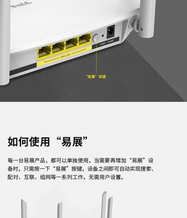 4个百兆口;无需区分WAN/LAN口,支持网口盲插; 最多8个易展路由同时使用