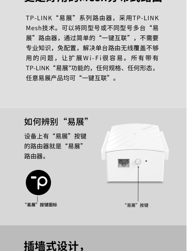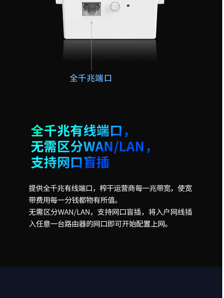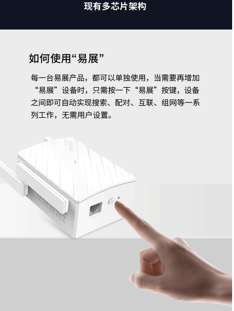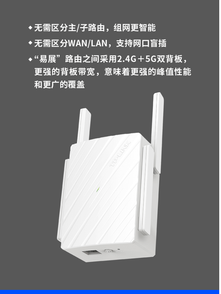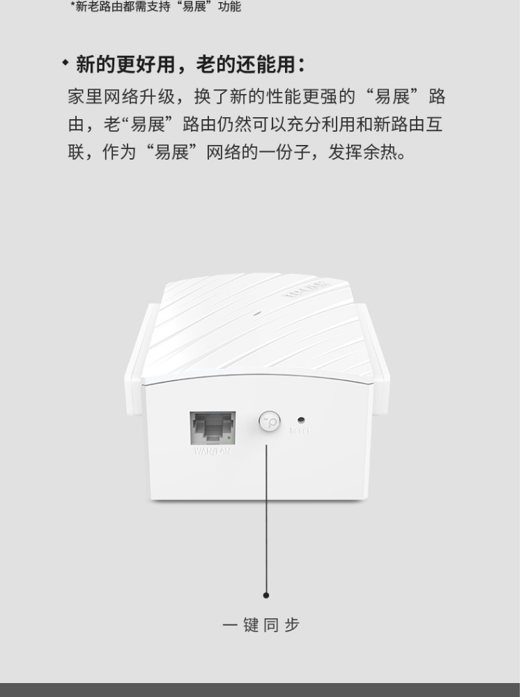 1个千兆口;插墙式/体型小巧;无需区分WAN/LAN口,支持网口盲插;最多8个易展路由同时使用;支持手机APP远程管理;