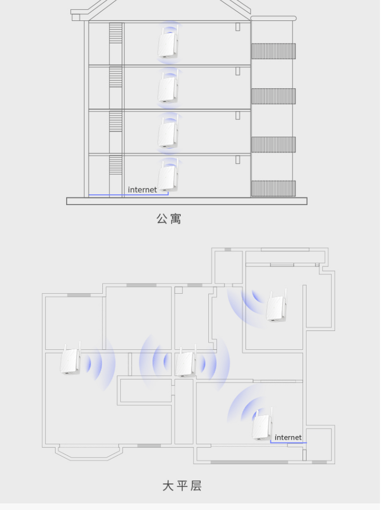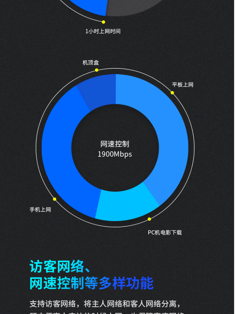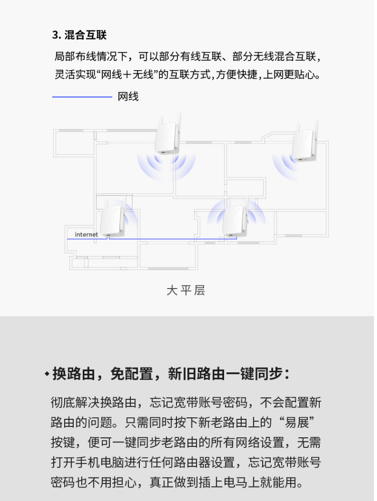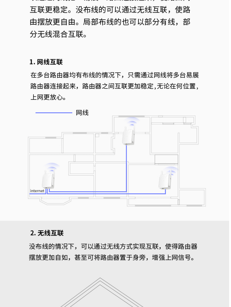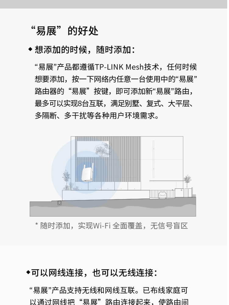 1个千兆口;插墙式/体型小巧;无需区分WAN/LAN口,支持网口盲插;最多8个易展路由同时使用;支持手机APP远程管理;