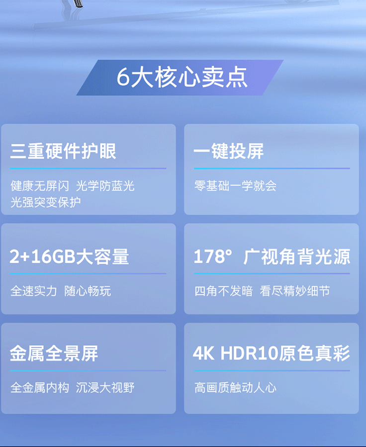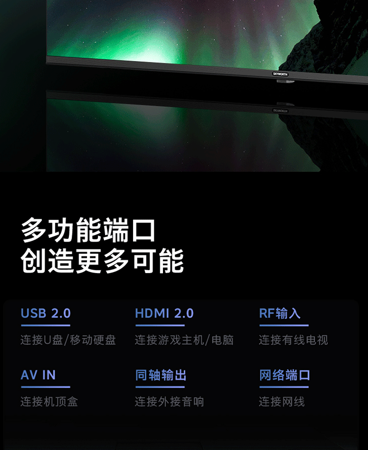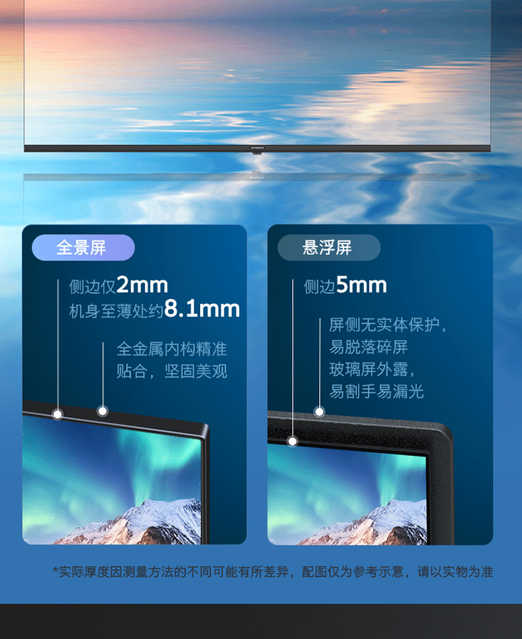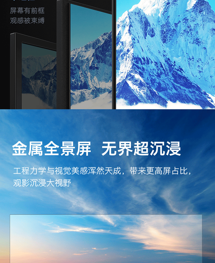 | 外观设计 | 边框宽窄:无边全面屏 安装孔距:400*200 机身最薄处:8.1mm 边框材质:上左右无, 黑色、塑料装饰条 |
