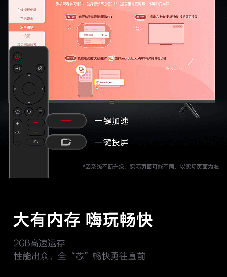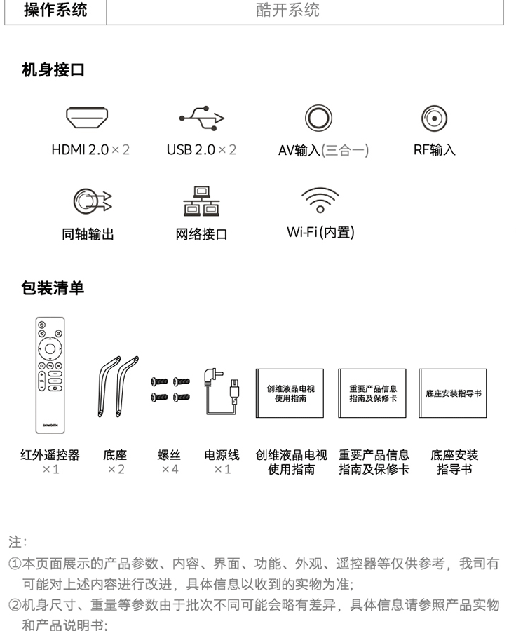| 电视附件 | 包装清单 底座、快速使用指南 x1 保修证 x1 遥控器 x1 |