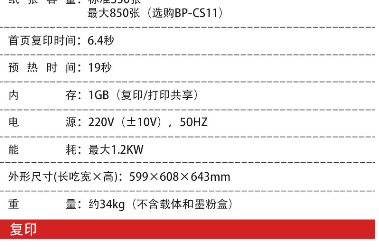| 产品净重(kg) | 约34kg(不含载体和墨粉盒) |
