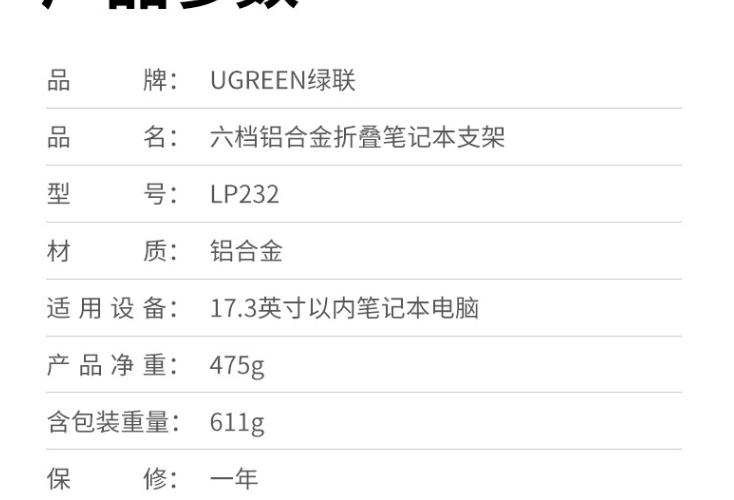 绿联 LP232 笔记本金属支架 前后六档 50128