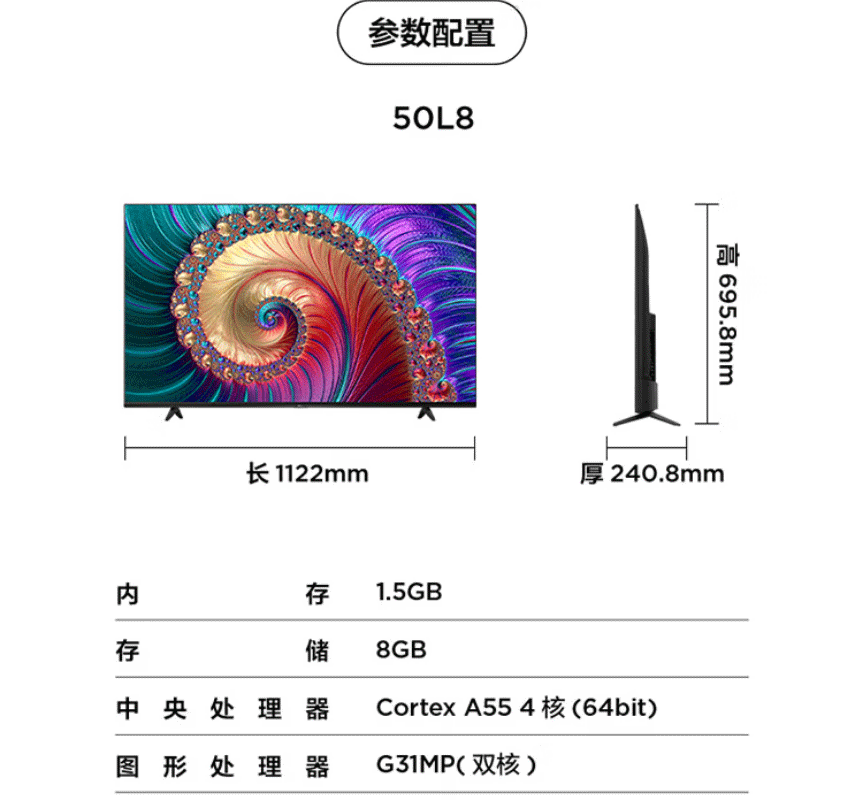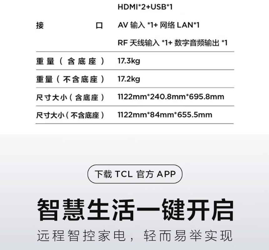 | 包装清单 | 电视机身 x1 遥控器 x1 电源线 x1 底座 x1 说明书 x1 |