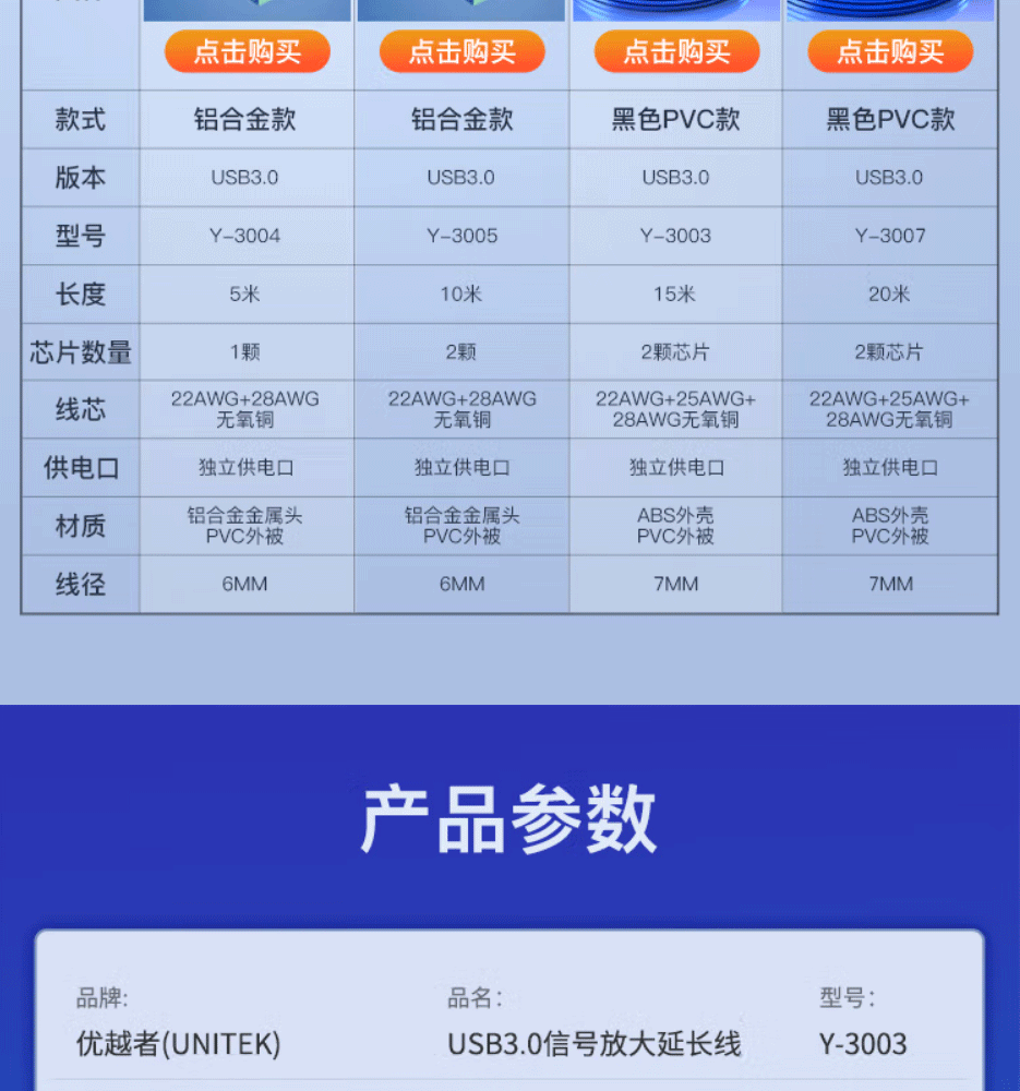 优越者 Y-3003 USB3.0延长线 放大延长器 15米