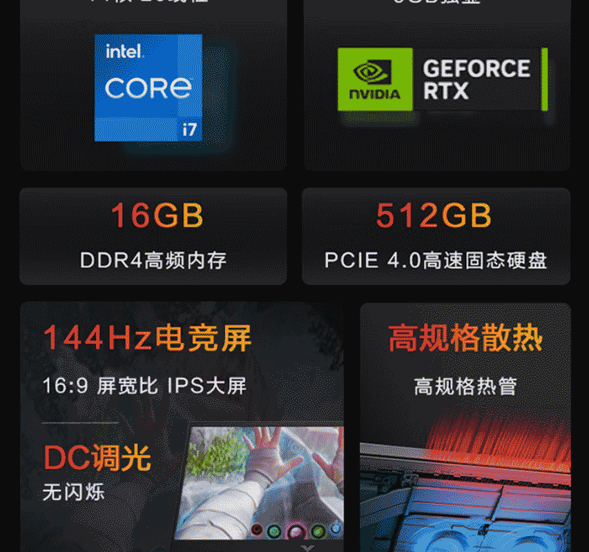 | 选机热点 | 高刷新屏幕,高色域屏幕,高分辨率屏幕,WiFi6,独显直连 |